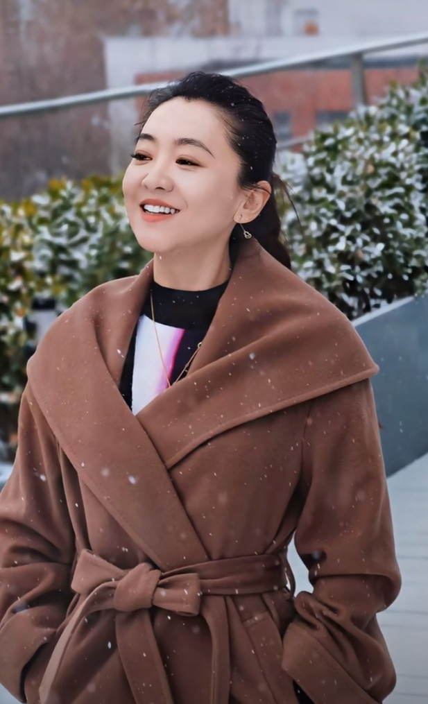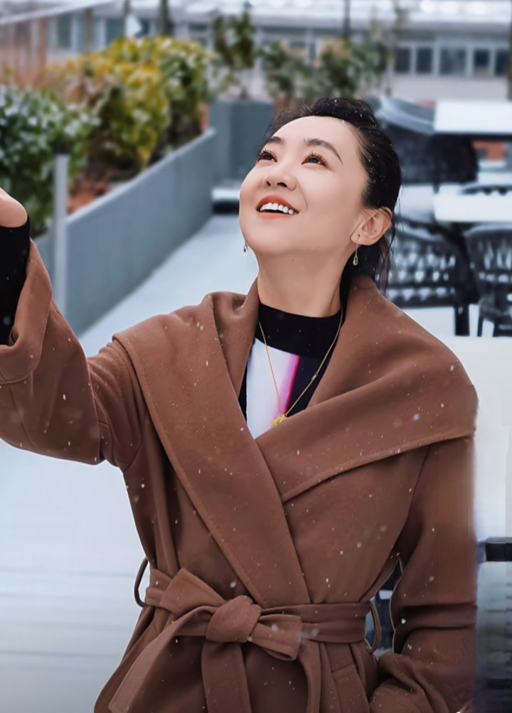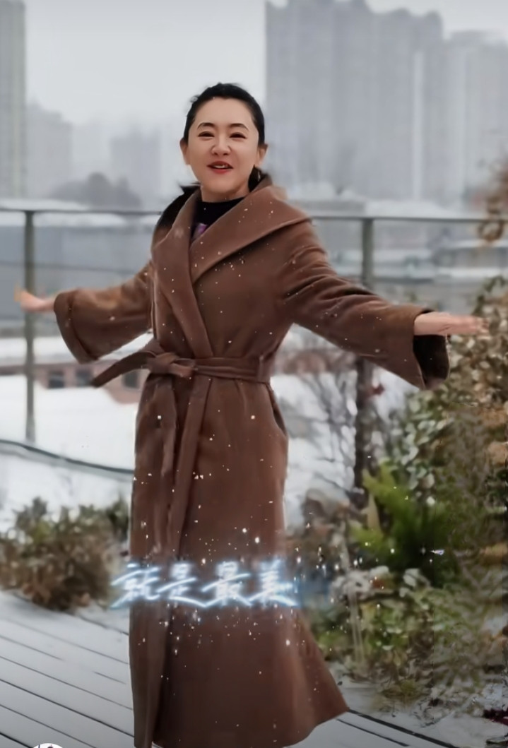 > 月亮姐姐咖色大衣配低马尾, 京城玩雪笑容明媚, 治愈感与美貌并存